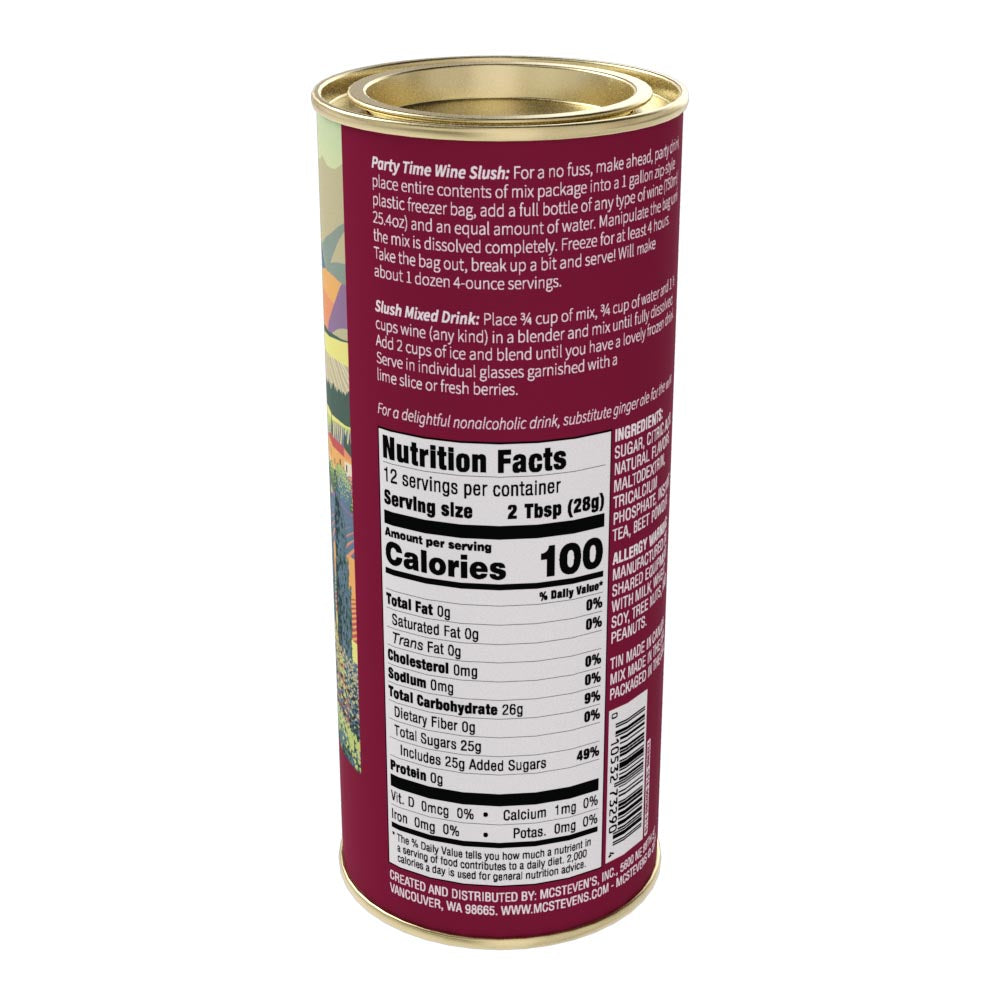 Perfect for any party or the end of the week this slushy is delicious! The mix comes in a resealable collectible canister. Net weight 12 oz.