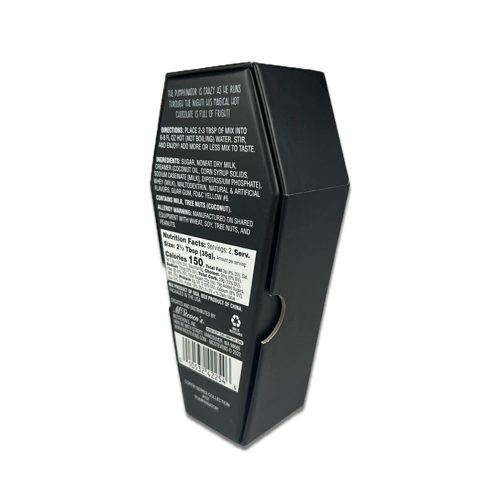 Get in the spooky spirit with our line of color-changing coffin hot chocolates. Mix the Pumpkinator with hot (not boiling) water and watch it magically turn ORANGE! Net weight 3oz.