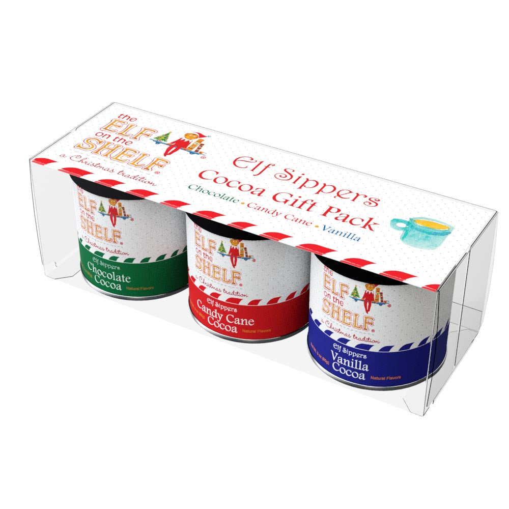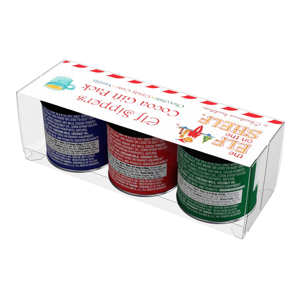 Our hot cocoa gift set features official The Elf On The Shelf® art on the covers of each canister and three flavors - Chocolate, Candy Cane, and Vanilla. Make someone's holiday by getting them the perfect cocoa gift. And the best part? Just add water to enjoy!