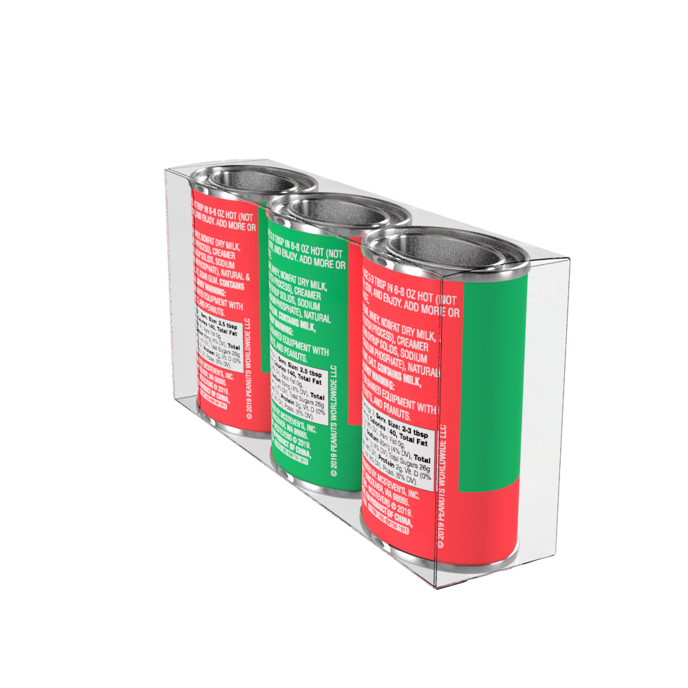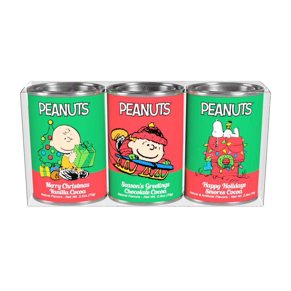 All your favorite Peanuts® characters are right here in our holiday collectible gift set. You'll enjoy Charlie Brown Vanilla Cocoa, Linus Creamy Chocolate Cocoa and Snoopy Smores Cocoa. The Peanuts® beloved characters are a must have. Net weight 7.5 oz.