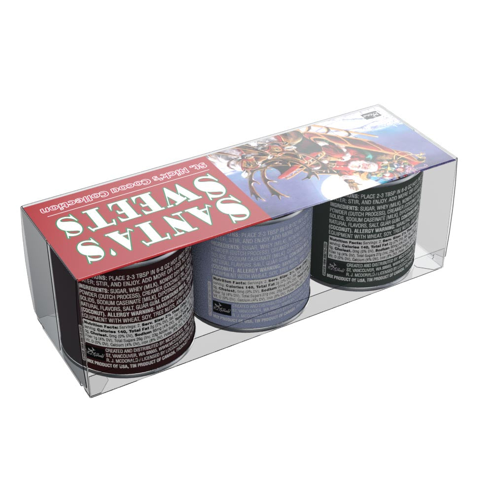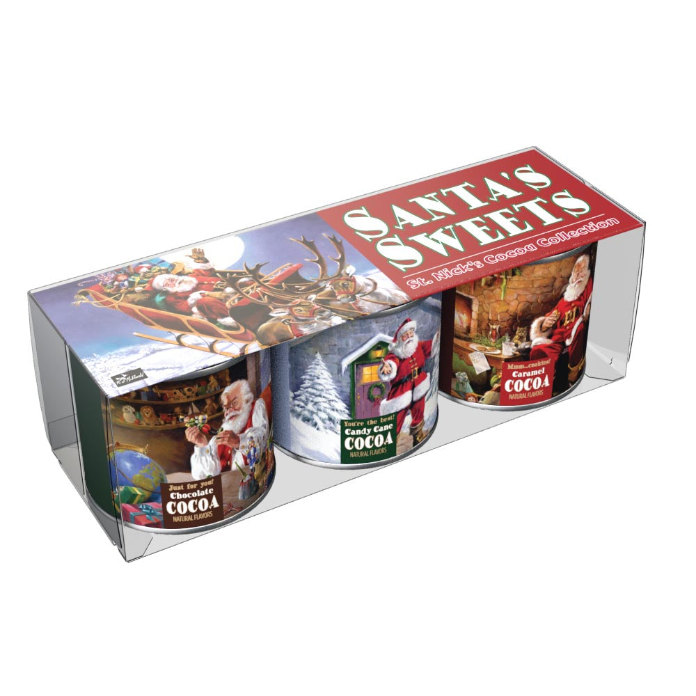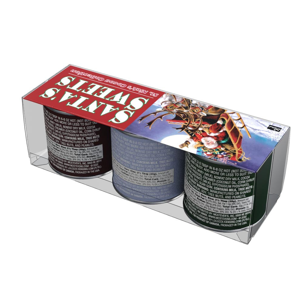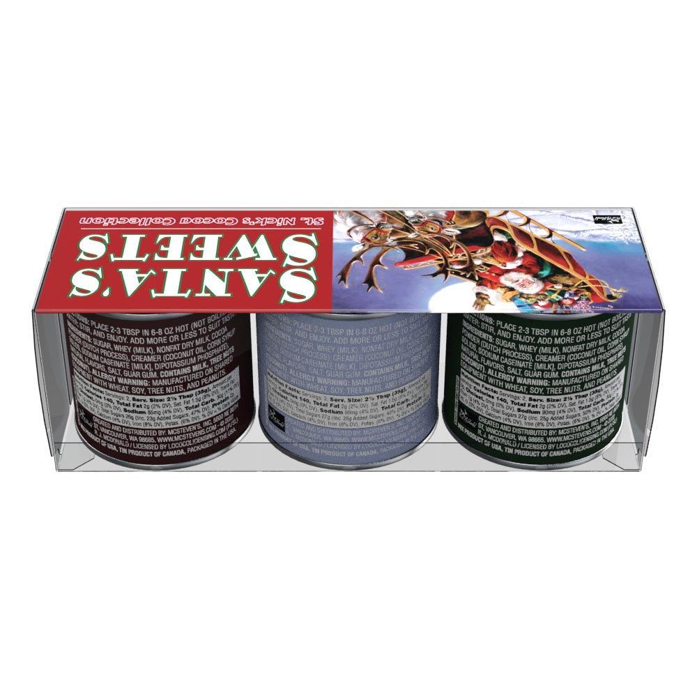 This gift set of McSteven's hot chocolate mix comes with three flavors, Chocolate Cocoa, Candy Cane Cocoa, and Caramel Cocoa. What's more, each 3 oz container of flavored cocoa mix is decorated with Ralph McDonald's Santa's Sweets artwork. This cocoa mix is absolutely delicious and extremely easy to make. Just add water! Net weight 3 oz each tin.