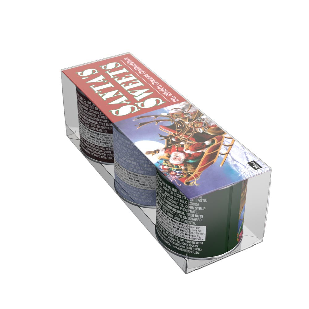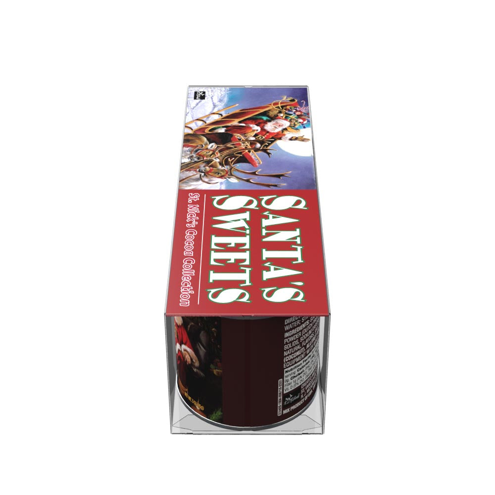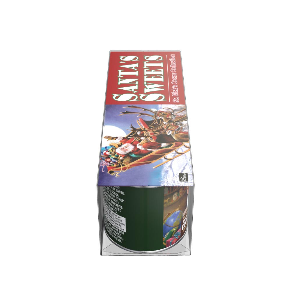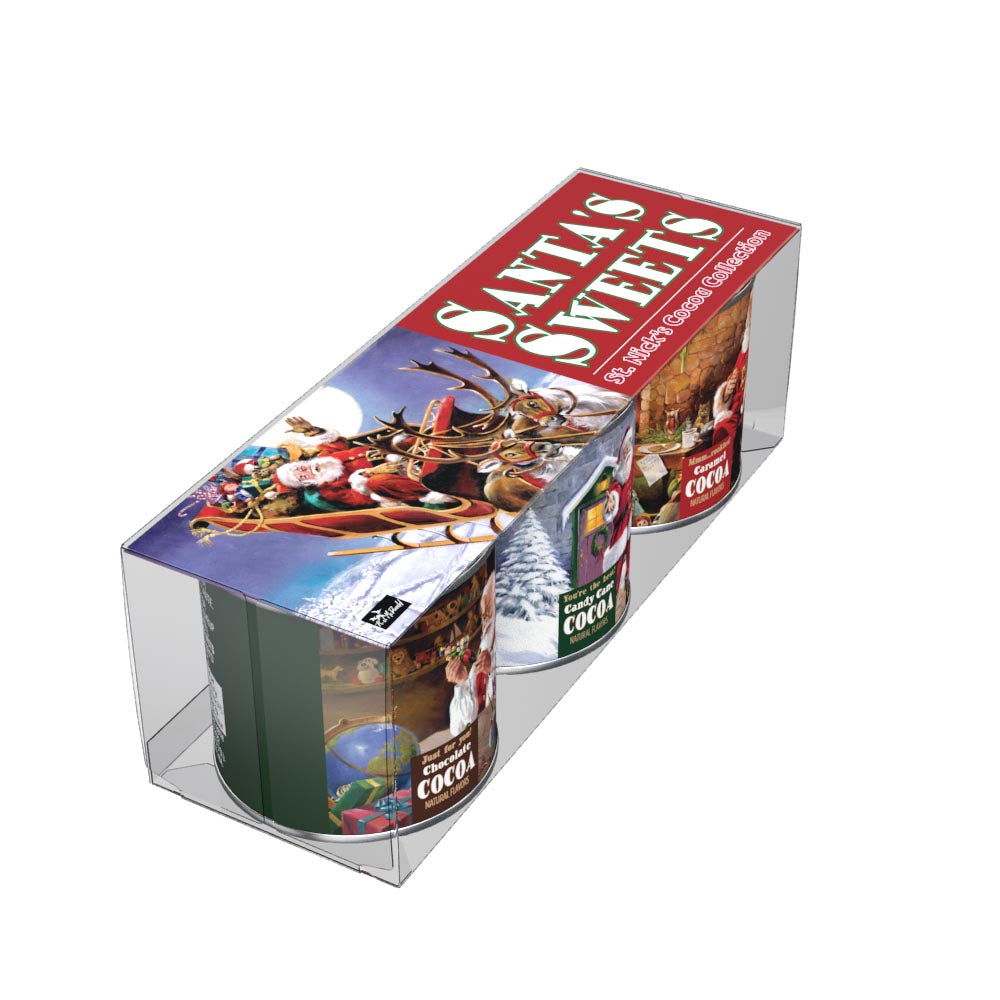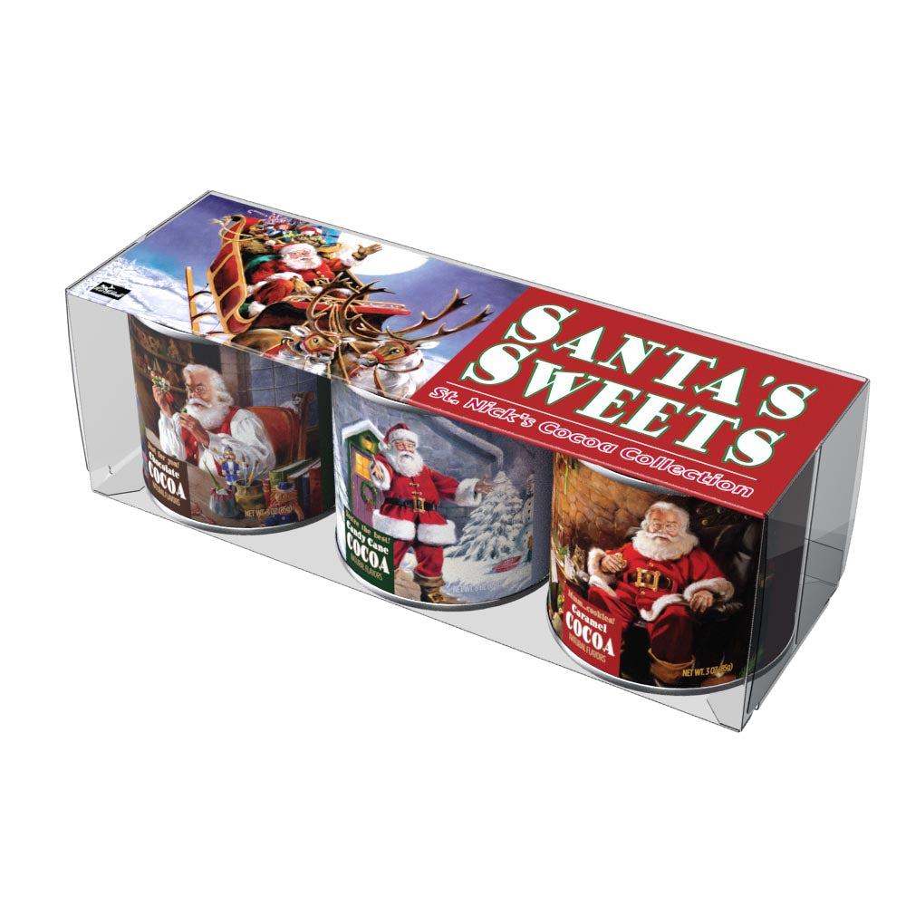 This gift set of McSteven's hot chocolate mix comes with three flavors, Chocolate Cocoa, Candy Cane Cocoa, and Caramel Cocoa. What's more, each 3 oz container of flavored cocoa mix is decorated with Ralph McDonald's Santa's Sweets artwork. This cocoa mix is absolutely delicious and extremely easy to make. Just add water! Net weight 3 oz each tin.